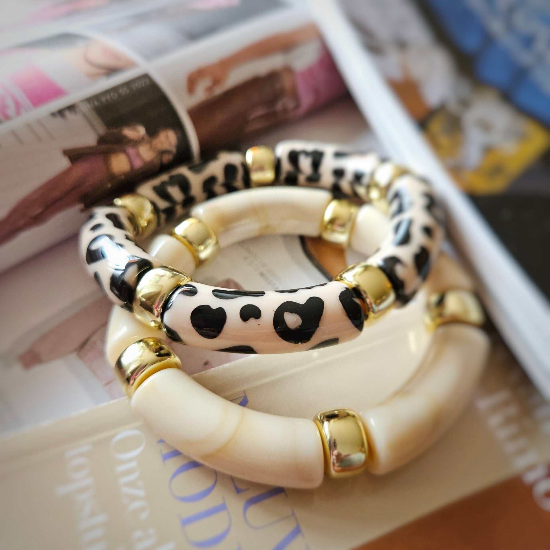 Trendy ruim vallende set van 2 acryl armbanden met goudkleur accent! Een echte Eye-catcher die niet mag missen in je sieradencollectie.